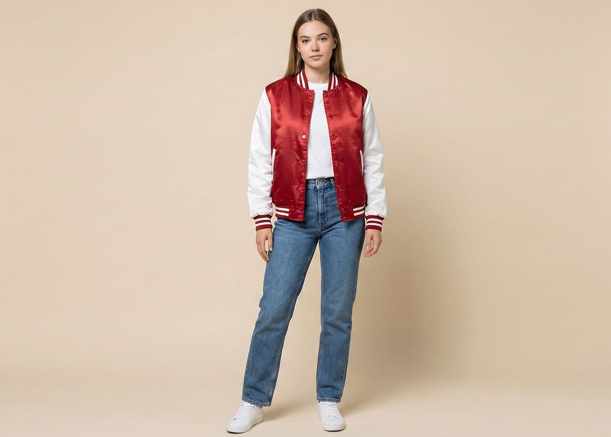 Shiny satin jackets are back in style. You see them in team shops, campus photos, and streetwear looks. Many women like them because they feel lighter than wool but still look strong and sporty.