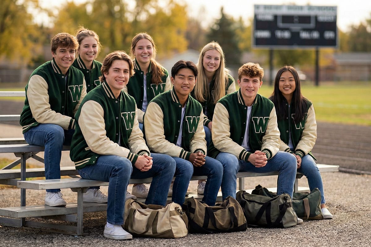 A custom letterman-style jacket gives a small group the same “we are a team” feeling that big programs get. Matching colors, the same front logo, and a simple back idea make your crew easy to spot in the stands, on the bus, or walking to class.